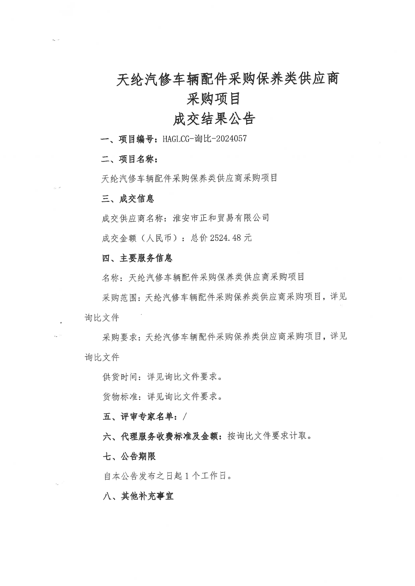 天綸汽修車輛配件采購保養(yǎng)類供應商采購項目成交結(jié)果公告