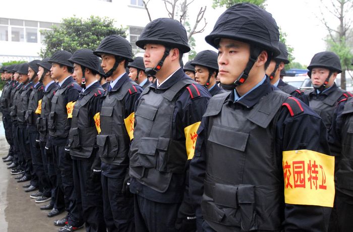 5月5日早晨6時許,全副武裝的校園特衛(wèi)人員整裝待發(fā)。自當(dāng)日起,江蘇省淮安市保安總公司首批46名配備鋼盔、防刺服、防割手套、防暴膠棒、滅火槍、催淚器等防護(hù)裝備的專職校園特衛(wèi)人員開始進(jìn)駐市直23所中小學(xué)和幼兒園,守護(hù)校園平安。這些人員都是從全市保安隊伍中精選出來的骨干,年齡在35歲以下,大都有部隊服役的經(jīng)歷,身體素質(zhì)和政治素質(zhì)較好,且受過專業(yè)訓(xùn)練。