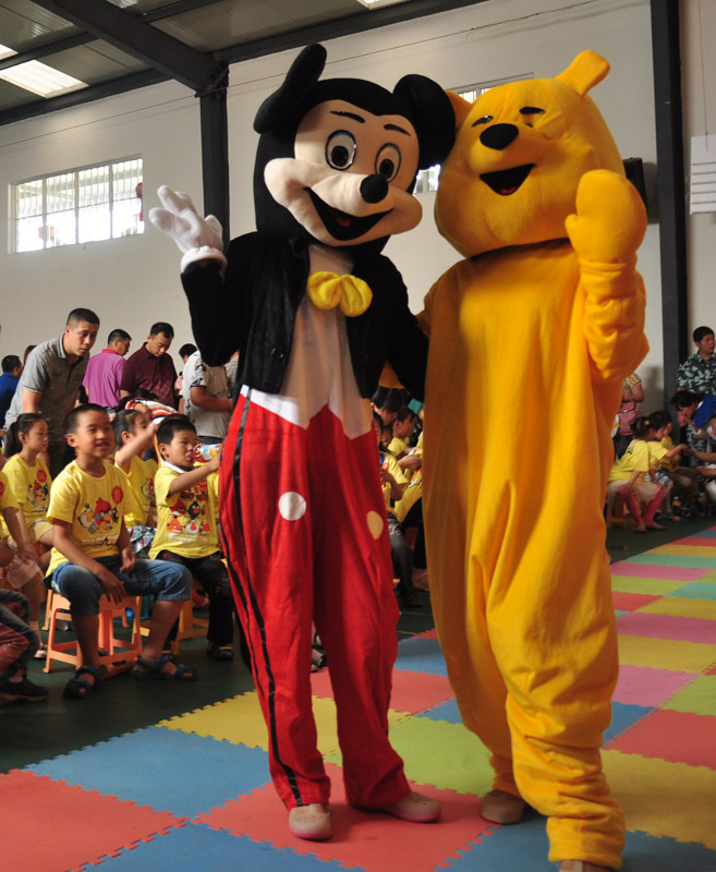 下午兩點,活動中心內(nèi),播放著一首首兒童歌曲,卡通人物喜羊羊、美羊羊、紅太郎、灰太狼、維尼小熊等在場內(nèi)和孩子們愉快的做著小游戲。每個到場的孩子憑著入場券在場內(nèi)領(lǐng)取了一件黃色的卡通T恤衫,還有食品和飲料。