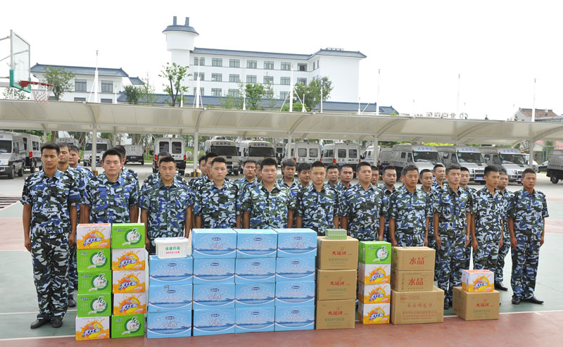 7月21日下午,為表達(dá)對冒著酷暑奮戰(zhàn)在安保一線的保安隊伍的敬意,淮安市總工會和淮安市公安局領(lǐng)導(dǎo)一行帶著飲料、洗滌用品和毛巾等來到總公司,在公司總經(jīng)理婁伯翱的陪同下,親切慰問了正在訓(xùn)練中的押運新隊員,將防暑用品送到他們的手中。