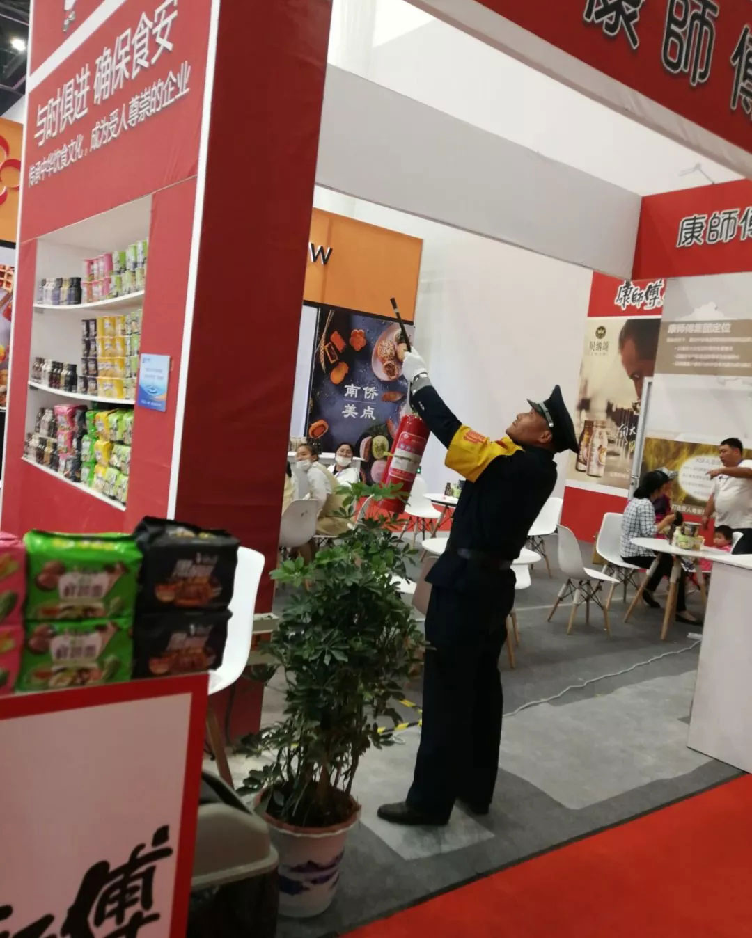 負(fù)責(zé)一樓2號(hào)展廳西一門人防中心保安員陳躍在9號(hào)中午12:20巡邏至康師傅展區(qū)時(shí)發(fā)現(xiàn)展館人員使用微波爐導(dǎo)致電路短路起火,為避免釀成火災(zāi),陳躍當(dāng)即采用干粉滅火器將明火撲滅,及時(shí)消除了一起安全隱患,確保了場(chǎng)館安全,受到指揮部領(lǐng)導(dǎo)的一致表?yè)P(yáng)。