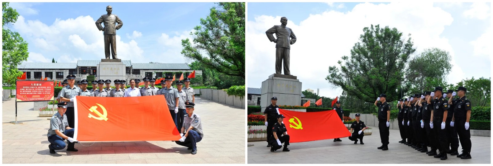 在周總理銅像廣場前,全體人員駐足緬懷。在趙愛忠同志帶領下,全體人員面向周總理銅像和鮮紅的黨旗,佩戴黨徽,舉起右手,握緊拳頭,重溫入黨誓詞,堅定理想信念。