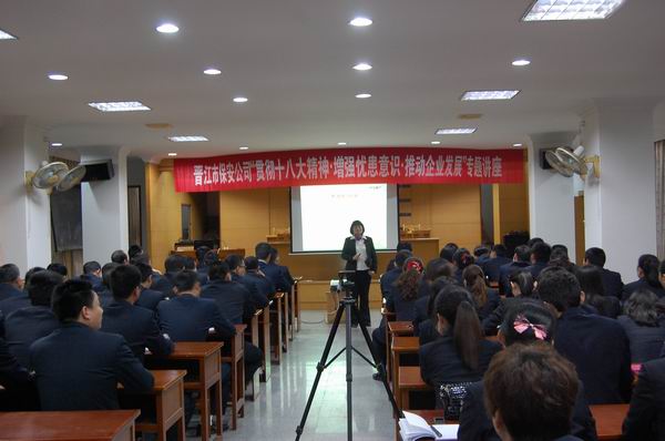 本網(wǎng)-福建省晉江市保安服務(wù)公司消息(通訊員 歐陽長青) 為進一步適應(yīng)日益激烈的市場競爭,切實推動企業(yè)持續(xù)發(fā)展,3月27日-28日,公司結(jié)合“增強憂患意識,推動長遠發(fā)展”大討論活動,舉辦“貫徹黨的十八大精神·增強憂患意識,推動企業(yè)發(fā)展”專題講座。晉江市委黨校副教授吳蓮妹應(yīng)邀前來授課。保安公司領(lǐng)導(dǎo)吳輝表、各部門經(jīng)理、工作人員等100多人聆聽了講座。