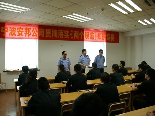 為全面推動寧波安邦護(hù)衛(wèi)有限公司學(xué)習(xí)省安邦護(hù)衛(wèi)有限公司《兩個(gè)規(guī)范》活動向縱深發(fā)展,進(jìn)一步營造全員參與的濃厚氛圍。2012年5月12日,寧波安邦護(hù)衛(wèi)有限公司組織開展“貫徹落實(shí)《兩個(gè)規(guī)范》知識競賽”活動。公司10支代表隊(duì)共49名選手參加了角逐,公司張正逸總經(jīng)理、董國平副總經(jīng)理到競賽現(xiàn)場巡考。