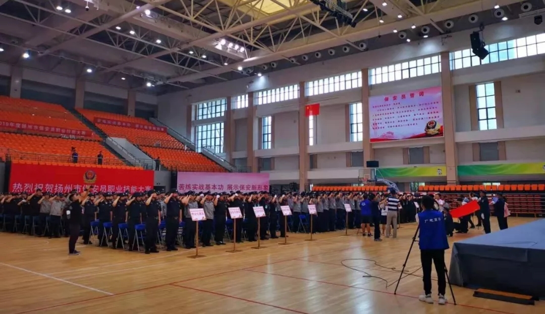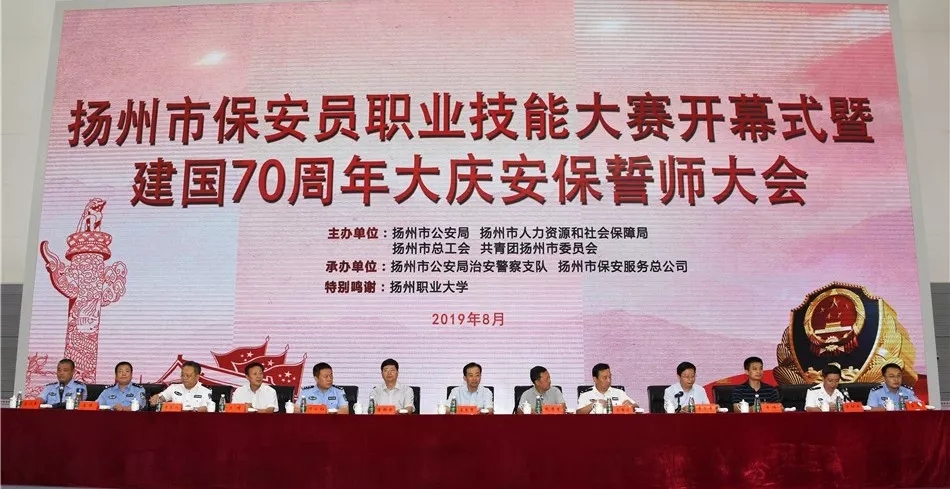 8月21日,2019年度揚州市保安員職業(yè)技能大賽開幕式暨建國70周年大慶安保誓師大會在揚州職業(yè)大學(xué)體育館隆重舉行,活動由市公安局、市人社局、市總工會、團(tuán)市委聯(lián)合舉辦。