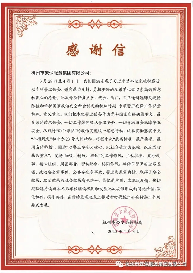 2020年3月29日至4月1日,習(xí)總書記來杭視察調(diào)研。杭州市安保服務(wù)集團(tuán)有限公司根據(jù)浙江省公安機(jī)關(guān)和特勤局要求,承擔(dān)此次重大安保任務(wù)。公司高度重視,迅速組建以公司黨委書記、董事長鄭雪林為組長的專項(xiàng)安保小組,在省市特勤局,屬地公安部門及相關(guān)單位的領(lǐng)導(dǎo)下,圓滿完成了習(xí)總書記在浙江調(diào)研期間的各項(xiàng)安保任務(wù)。