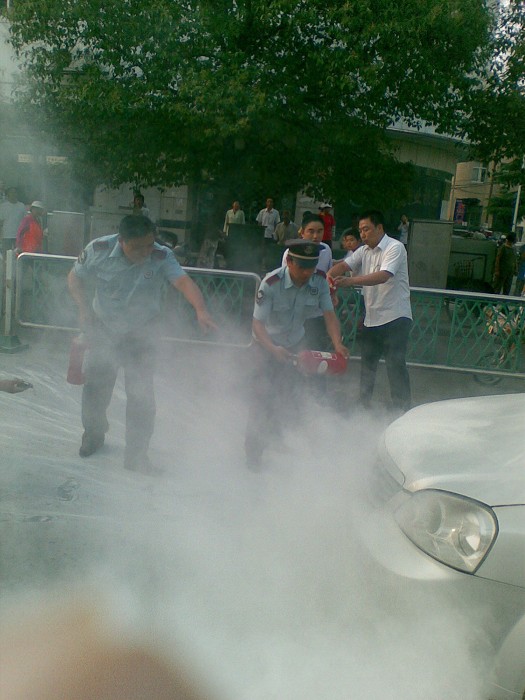 當天,健康東路上一輛蘇AV486白色別克轎車在行駛至市財政局門前時車頭突然冒煙,隱約有明火竄出,引來路邊很多市民圍觀,正在市財政局開會的保安大隊長薛松發(fā)現(xiàn)后,立即帶隊員尚月龍?zhí)嶂鴾缁鹌髭s到現(xiàn)場,一邊疏散周圍路人和過往車輛。一邊用滅火器進行撲救,由于撲救及時,該車損失不大。