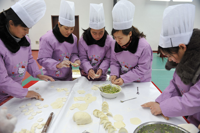 早晨9點(diǎn)鐘,每位選手都戴上了廚師帽、穿上了色彩鮮艷的圍裙,為比賽增添了一道靚麗的風(fēng)景。每支隊(duì)伍舉著自己的宣傳牌,伴隨著激昂的口號,步入了活動(dòng)中心,每支隊(duì)伍看起來都?xì)鈩莘欠病kS著裁判員的一聲令下,比賽正式開始,四支隊(duì)伍展開了緊張的比拼。隊(duì)員們開始揉面、搟皮、包餃子,動(dòng)作嫻熟、有條不紊。從和面開始,大家密切分工,團(tuán)結(jié)合作,你和面來,我加水,你搟皮來,我包餃,爭分奪秒,忙得不亦樂乎?,F(xiàn)場各隊(duì)的加油聲、歡笑聲和餐具的碰撞聲交織成一曲歡快的交響樂…….轉(zhuǎn)眼間,包好的餃子就擠滿了桌面。數(shù)量是有了,還要看質(zhì)量和口味。