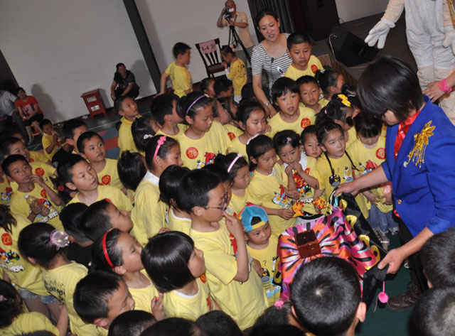 當小朋友們還沒有從魔術(shù)的神奇中回過神來,小丑哥哥的滑稽表演立即又吸引了孩子們的視線。小丑哥哥到臺上和大家一起玩《憤怒的小鳥》游戲,小丑哥哥滑稽的表演讓小朋友們哄堂大笑。彈射出的不僅是玩具娃娃,更給小朋友們送去了快樂和幸福。第四個是小游戲,《雙雙對對對》,讓小朋友們到舞臺上和卡通人物一起互動,孩子們圍成一個圓圈尋找伙伴,使陌生的孩子們擁抱在一起,尋找到友情,同時理解了團結(jié)就是力量。變臉大師把國粹變臉的絕活展現(xiàn)得淋漓盡致,整個表演一氣呵成。