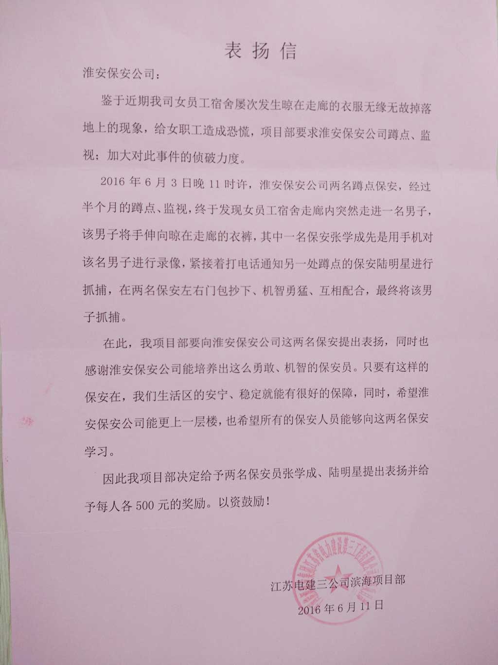 2016年6月11日駐江蘇電建三公司濱海項(xiàng)目部濱海執(zhí)勤點(diǎn)保安員張學(xué)成、陸明星智勇擒賊的行為提出了表揚(yáng),并給予現(xiàn)金獎(jiǎng)勵(lì)。