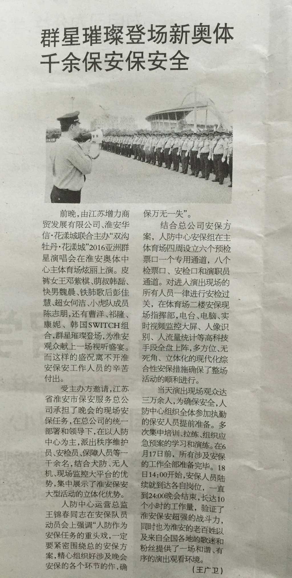 由江蘇增力商貿(mào)發(fā)展有限公司、淮安華信·花漾城聯(lián)合主辦“雙溝牡丹·花漾城”2016亞洲群星演唱會(huì)于6月18日晚上在淮安奧體中心主體育場(chǎng)炫麗上演。受主辦方邀請(qǐng),我公司承擔(dān)了晚會(huì)的現(xiàn)場(chǎng)安保任務(wù)。當(dāng)天現(xiàn)場(chǎng)觀眾達(dá)三萬(wàn)余人,為確保安全,在總公司的統(tǒng)一部署和領(lǐng)導(dǎo)下,派出了秩序維護(hù)員、安檢員、保障人員等一千余名的強(qiáng)大陣容,同時(shí)結(jié)合犬防、無(wú)人機(jī)、現(xiàn)場(chǎng)監(jiān)控大屏等優(yōu)勢(shì),集中展示了淮安保安大型活動(dòng)的綜合立體化優(yōu)勢(shì)和超強(qiáng)的戰(zhàn)斗力,受到了社會(huì)各界的充分肯定和高度評(píng)價(jià),并于2016年6月21日在《淮海晚報(bào)》上以“群星璀璨登場(chǎng)新奧體,千余保安保安全”為題予以宣傳報(bào)道。