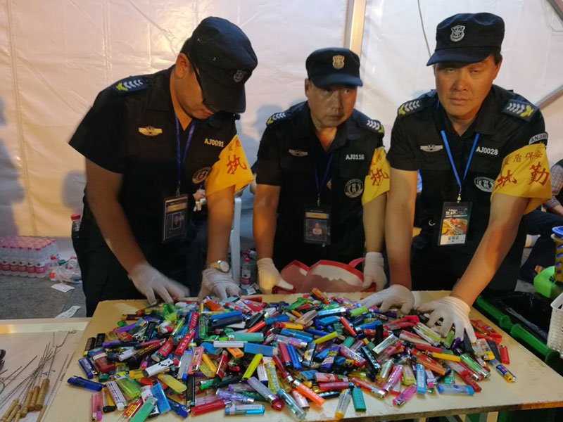 在此次是兩天的晚會安保工作中,保安員共查獲各類假證50余張,違禁品15000余件,其中包括打火機(jī)5000余只,各類液體、飲料、化妝品等9000余瓶,管制刀具、剪刀等18把。確保了音樂節(jié)活動順利、有序、安全。
