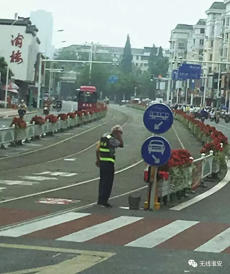 照片中,一位有軌電車保安隊員在酷暑中堅守崗位,他的腳邊放著一只小鐵桶,執(zhí)勤過程中實在熱了,他就用毛巾擰一把擦汗降溫。市民周先生被這一幕深深感動,遠遠的拍下了幾張照片。